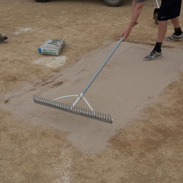 - Bury under batter’s boxes, catcher’s box, around bases and pitching areas