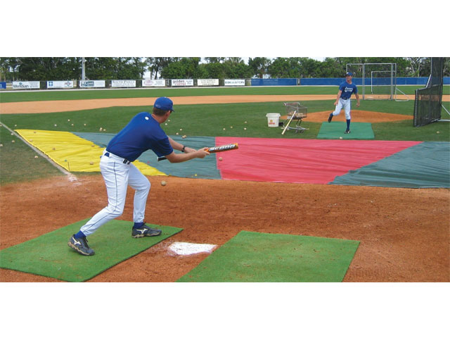 Thiis Bunt Zone® Infield Protector is 24′ Short Side x 64′ Long Side x 15′ Deep. It doubles as the perfect bunting practice target training system. Constructed with a special 9 oz. vinyl coated polyester mesh, an industrial grade material with UV and mildew inhibitors. All seams are fusion welded. Full perimeter is hemmed around 1″ webbing reinforcement and double-stitched with UV resistant thread. Grommets installed at corners and color change points. Ground stakes are included.