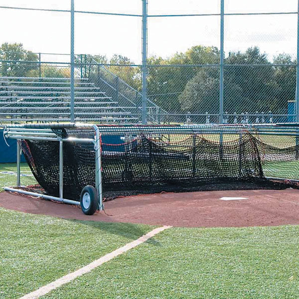 Double netting behind batter!  Extra width to accommodate left or right hand hitters without shifting the cage.  Has three 16″ diameter, 6″ hub, ball bearing, multi-directional pneumatic tires.  The back tire features a unique lever device for easy mobility.  Constructed of 2″ OD Flo-coated steel.  Collapsible for easier portability and storage.  Heavy duty 3.5mm weather treated EHT netting.  Size:  16.5′ W x 16.5′ D x 11′ H.