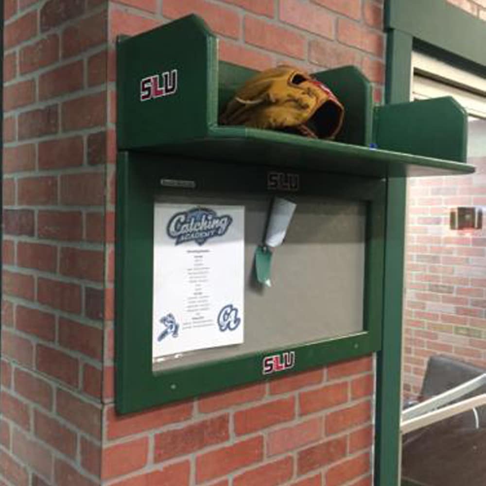 Shelf & Bulletin Board to keep Game Ready information near you during games • Shelf size: 31″ wide x 7-¼” tall • Bulletin Board Size: 25″ wide x 14″ tall in a 31″ wide x 20″ tall frame • An added edge for any program • Painted in team colors • Optional team logos available • No assembly required